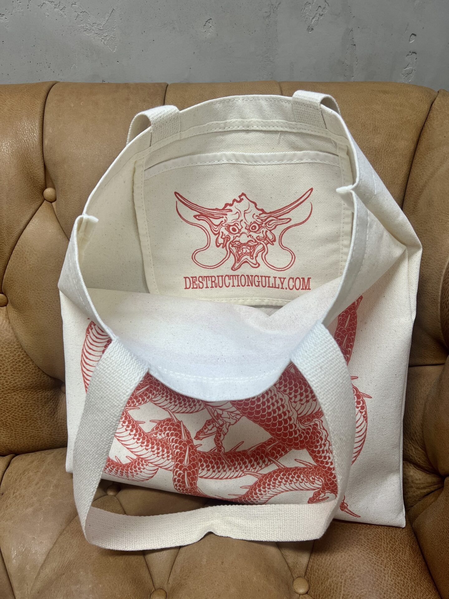 Premium screen printed canvas tote bag in Natural colour. Intricate Dragon on one side and DG mask on the other side. Tote has a handy phone pocket on the inside that fits your phone. Dimensions 350 x 390 mm